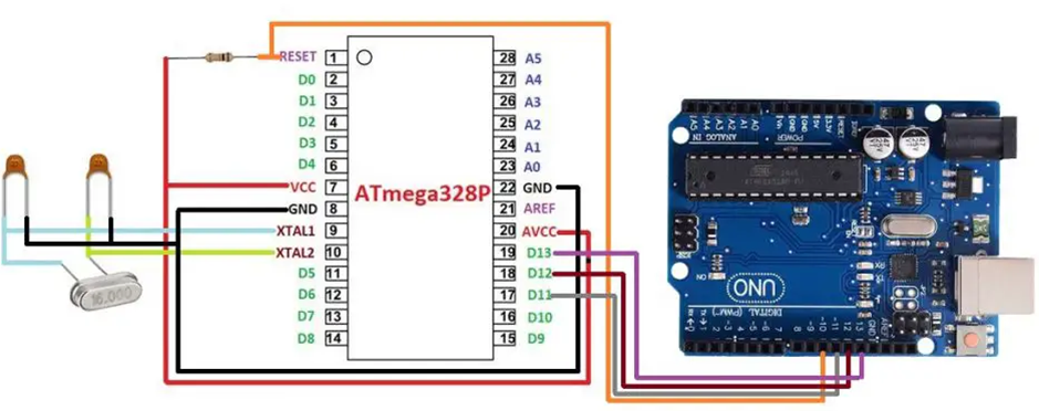 پین های مشخص شده روی برد Arduino UNO در آی سی ATmega328P متفاوت است. برای پیکربندی پین آی سی ATmega328P به شکل زیر مجدداً مراجعه کنید. و کریستال 16 مگاهرتز، خازن های 22 پیکوفارادی، ال ای دی 5 میلیمتر و مقاومت های 330 اهم و 10 کیلو اهمی را مطابق شکل بالا متصل کنید.